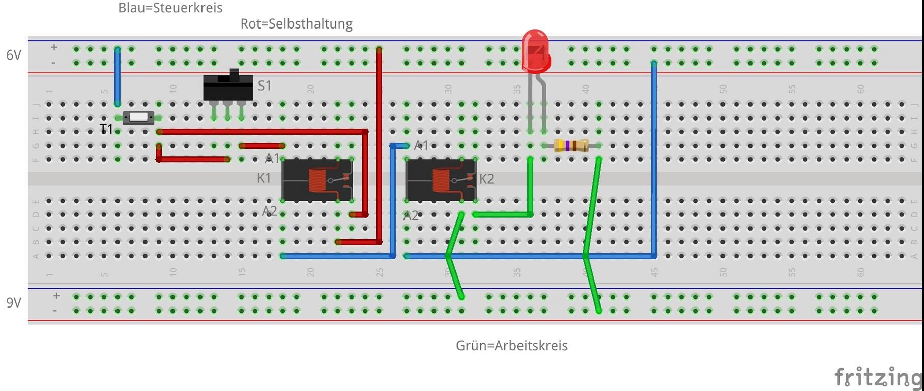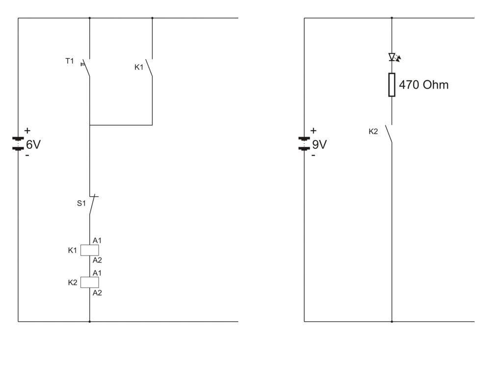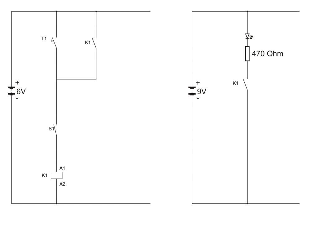 Um die obige Selbsthaltung nachzubauen, ist normalerweise ein Relais mit mindestens zwei Schließern nötig. Sollte kein derartiges Relais zur Verfügung stehen, so können auch zwei Relais mit je einem Schließer genutzt werden. In diesem Fall übernimmt ein Relais den Aufbau der Selbsthaltung, während das zweite Relais dafür sorgt, dass ein im Arbeitskreis liegender Verbraucher mit Strom versorgt wird.