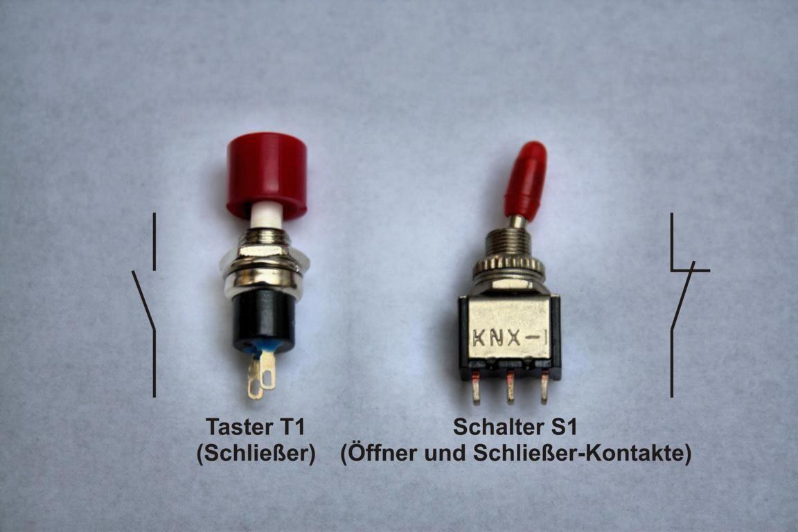 Im untenstehenden Beispiel werden ein manuell bedienter Schalter als Öffner ›S1‹ und ein manuell bedienter Taster ›T1‹ als Schließer verwendet.