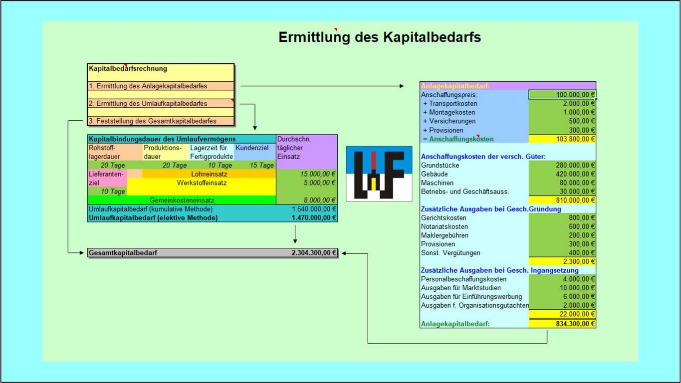 Um den Anlagenkapitalbedarf zu ermitteln, sind die Anschaffungskosten der benötigten Anlagegüter zu ermitteln. Zum Anschaffungspreis für Maschinen, Grundstücke, Gebäude und Betriebsausstattungen gehören natürlich auch die Transport- und Montagekosten, Versicherungen und Provisionen sowie Gerichts- und Notarkosten.