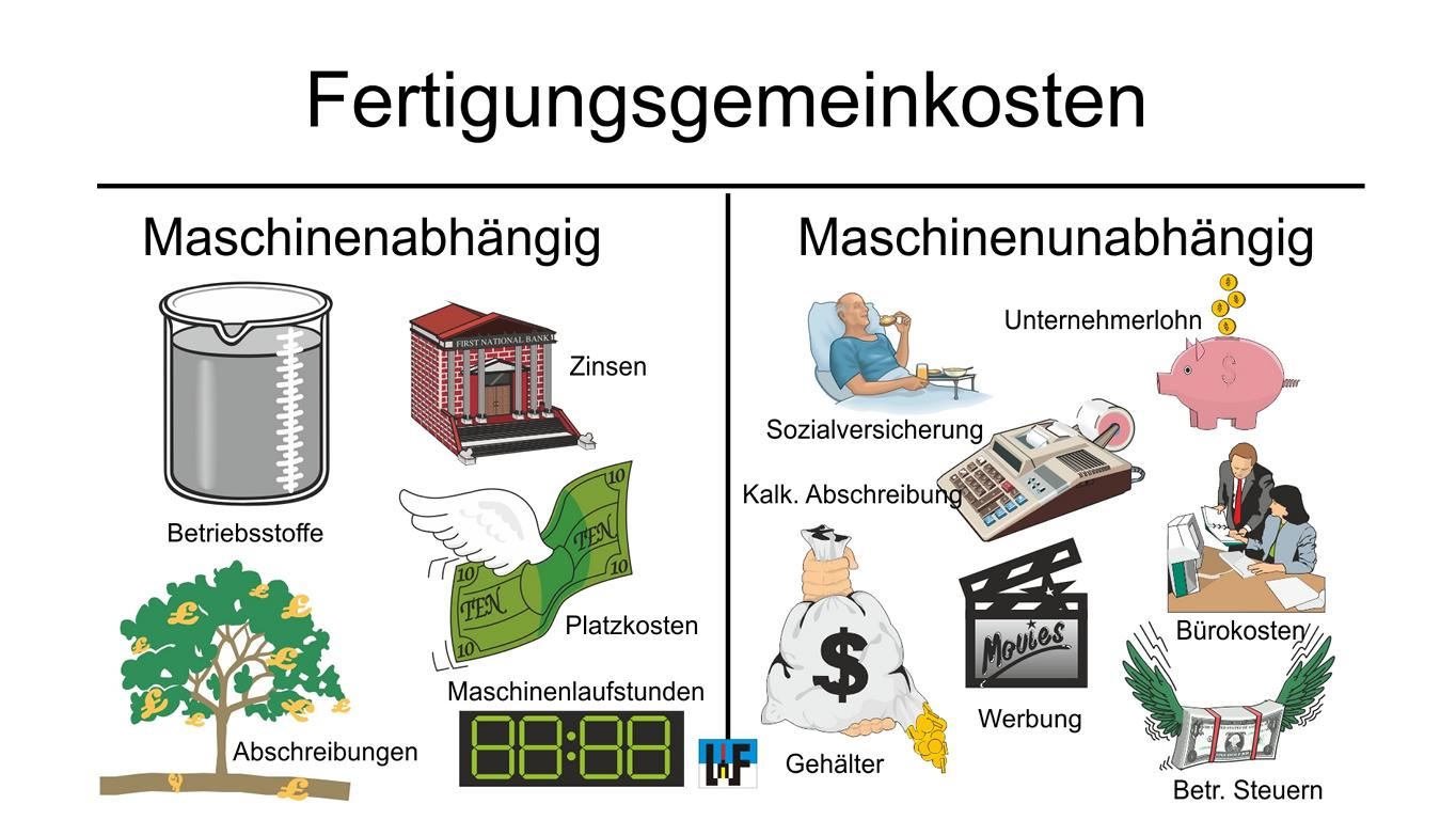 Zu den maschinenabhängigen Fertigungsgemeinkosten gehören Betriebsstoffe, die Abschreibung, Platzkosten, Zinsen und die Maschinenlaufstunden. Die Restgemeinkosten setzen sich aus den Gehältern, dem Arbeitgeberanteil für die Sozialversicherung, der kalkulatorischen Abschreibung, den Bürokosten, den Kosten für Werbung, den betrieblichen Steuern und dem Unternehmerlohn zusammen.