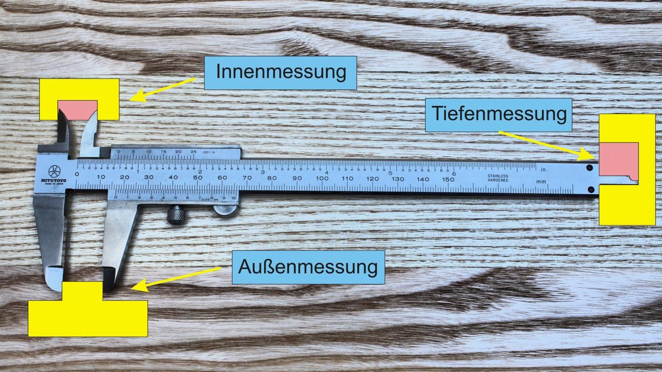 Das ermittelte Maß gilt für alle drei Messmöglichkeiten des Messschiebers. Die bedeutet, dass es sich um einen Außendurchmesser, einen Innendurchmesser oder ein Tiefenmaß handelt, auf das der ermittelte Wert zutrifft.