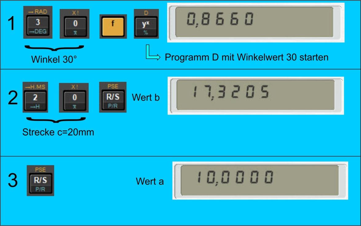Nachdem im Schritt 1 der Winkelwert (30 Grad) eingegeben wurde, berechnet der HP 15 c den Cosinus für diesen Winkel und zeigt diesen im Display an. Der im Programm eingebaut Befehl R/S (Run/Stop) hält das Programm an, was es ermöglicht, nun den Wert für die Strecke c (20mm) einzugeben. Nachdem der Wert über die Tastatur eingegeben wurde, kann über die Taste R/S der unterbrochene Programmlauf neu gestartet werden, woraufhin das Ergebnis für den Wert b im Display ausgegeben wird (17,3205mm).
