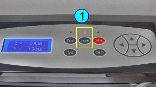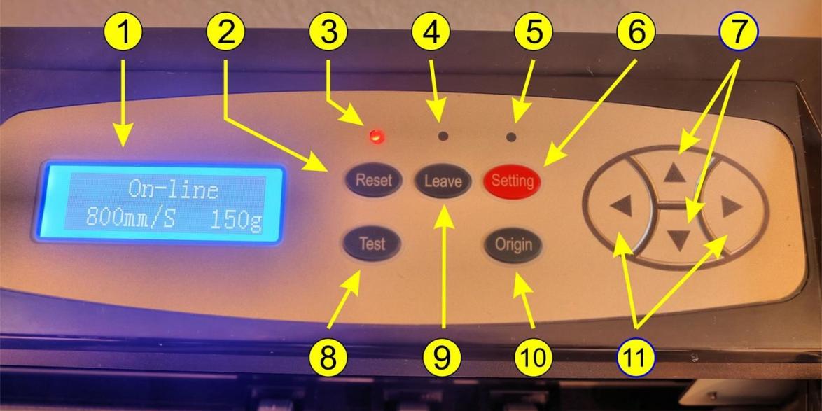 9 Leave-Button: Der „Leave“-Button dient dazu, den Plotter aus dem Online-Modus (in dem er Daten vom Computer empfängt) in einen Offline-Modus zu versetzen. Dieser Button kann genutzt werden, um den Plotter anzuhalten, damit nach einem Test-Schnitt die Position des Nullpunkts geändert werden kann, ohne den gesamten Auftrag abzubrechen.
