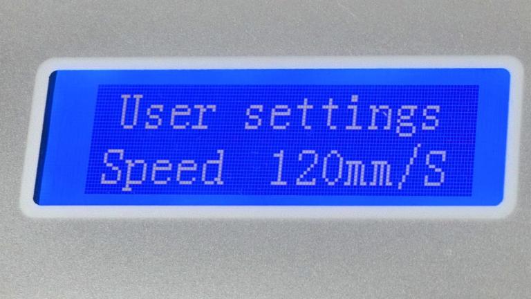 Über die Tasten 7 wird die Größe des Werts bestimmt. Dabei wird über die Taste „Auf“ der Wert erhöht, wohingegen dieser über die Taste „Ab“ verringert wird. Die Schnittkraft kann in einem Bereich von 10 g bis 500 g eingestellt werden, während für die Geschwindigkeit Werte im Bereich von 20 bis 800 Millimeter pro Sekunde einstellbar sind.