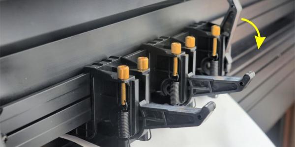 Damit das Papier beziehungsweise die Folie sauber geführt wird und während der Bearbeitung nicht verrutscht, müssen die Andruckrollen mit einer gewissen Kraft auf das zu bewegende Medium einwirken. Diese Kraft wird durch Umlegen der hinten befindlichen Hebel in eine waagrechte Stellung aufgebracht.