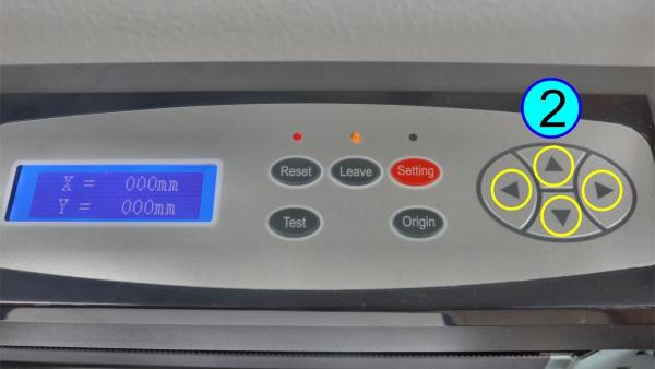 Mittels der Pfeiltasten (Nr. 7/11) kann nun der Schneidekopf manuell an die untere rechte Ecke des Materials bewegt werden. Diese Position ist der Startpunkt. Für eine exakte Positionierung kann das Display herangezogen werden, wo die Positionswerte angezeigt werden.