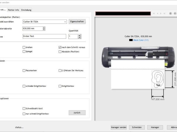 Nun kann per Klick auf den Button „Schneiden“ der Plottvorgang gestartet werden. Dabei muss am Plotter nichts für den Empfang der Daten eingestellt werden. Der Plotter nimmt automatisch die Daten entgegen und plottet beziehungsweise schneidet entsprechend der Zeichnung das Papier beziehungsweise Vinyl zu.