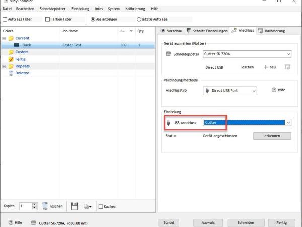 Sollte die USB-Verbindung noch nicht bestehen, so meldet sich der Vinyl Spooler. In diesem Fall muss noch in „Einstellung“ der USB-Anschluss auf „Cutter“ eingestellt werden.