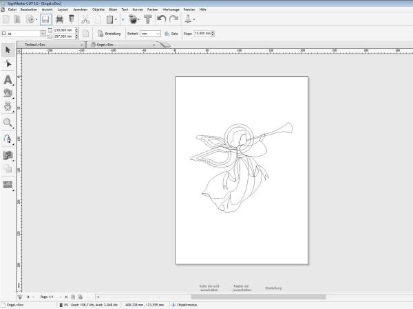 Mit dem Plotter wird das Programm SignMaster mitgelieferte, das es erlaubt, Grafiken anzufertigen und diese an den Plotter zu senden. Für einen ersten Testdruck wird ein neues Dokument angelegt und werden wahllos einige Elemente, wie Geraden, Kurven und Text erzeugt.