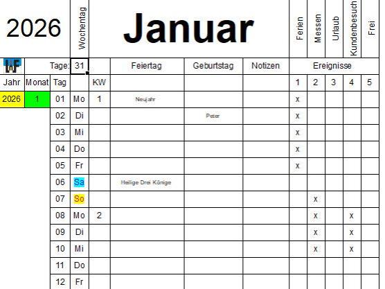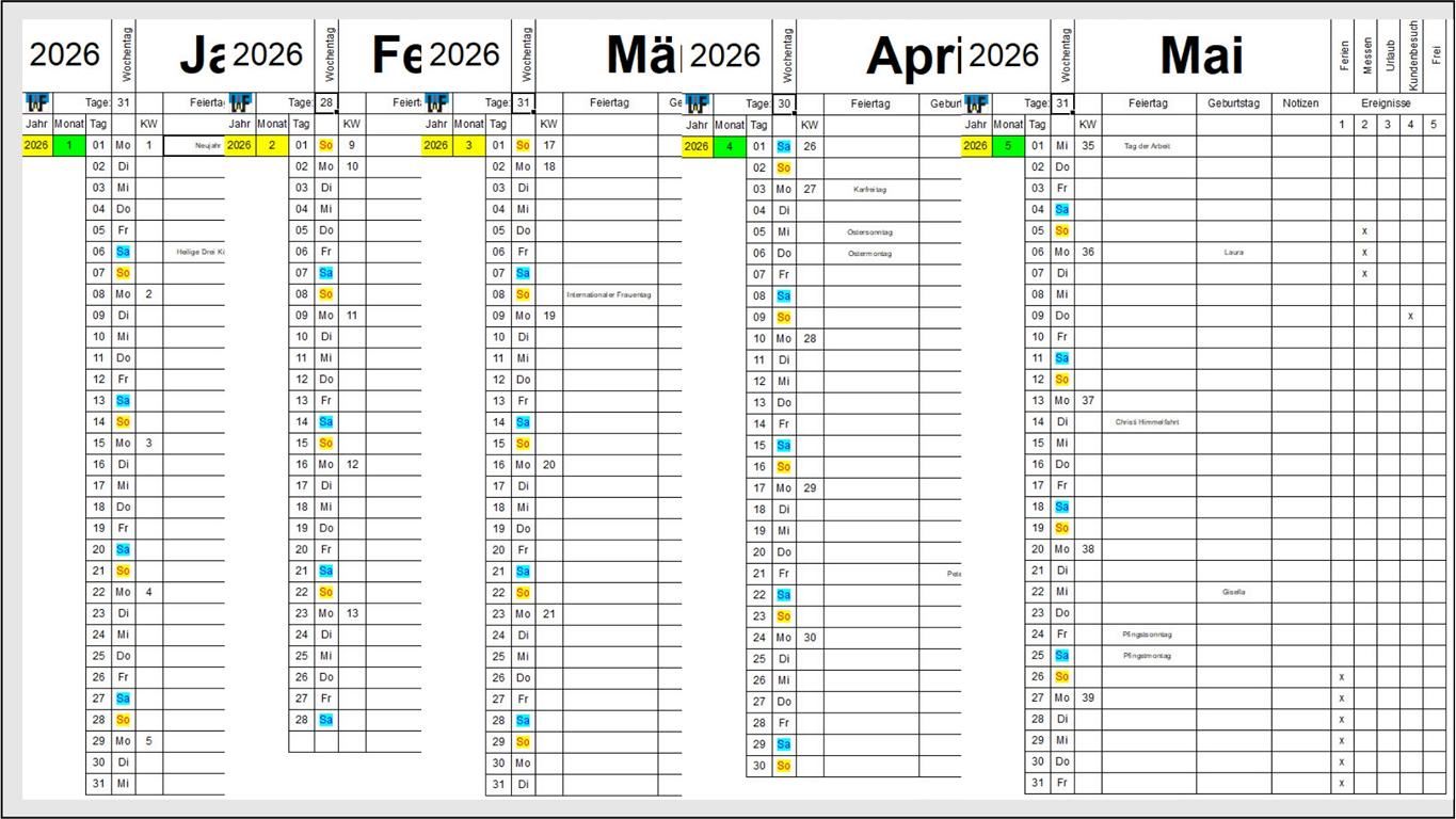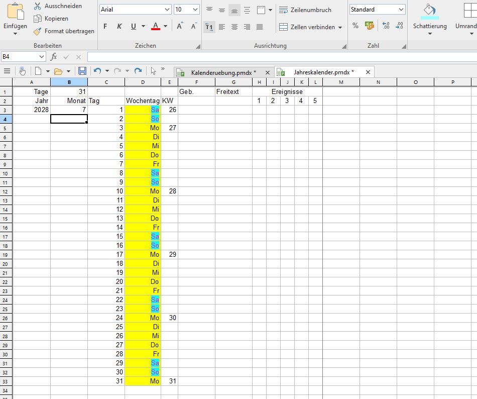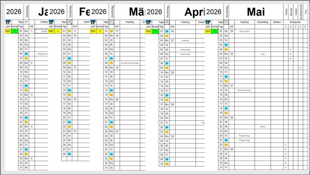 Ob Privat oder im Büro – Jahreskalender erfreuen sich großer Beliebtheit. Diese werden oft mit Zusatzinformationen, wie etwa Geburtstagen, Urlaubszeiten oder Eventterminen ergänzt. Da diese Arbeiten jedes Jahr anfallen und zum Eintragen ein gewisser Zeitaufwand nötig ist, macht es Sinn, einen derartigen Kalender selbst zu erstellen.