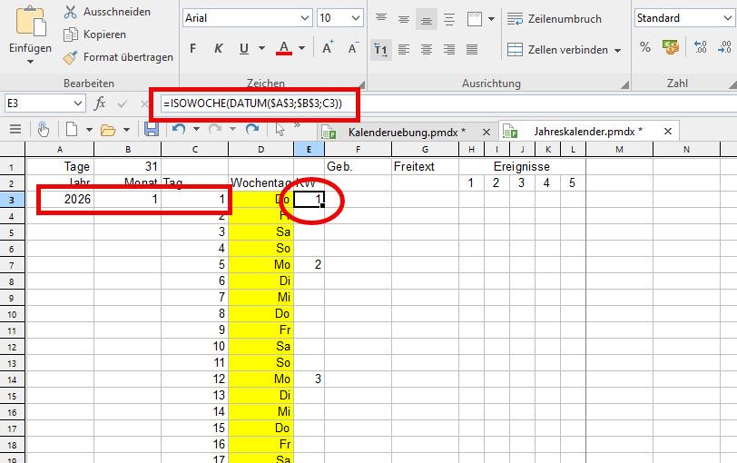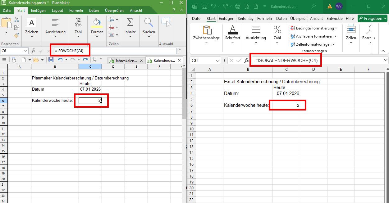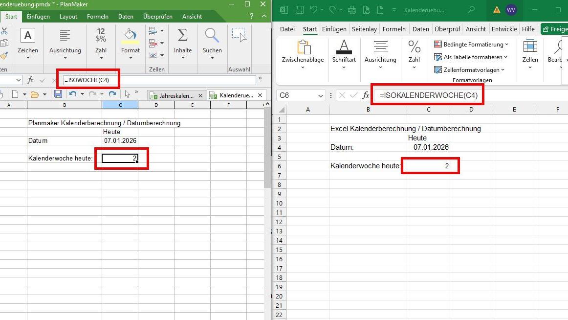 Die Berechnung der Kalenderwoche ist in beiden Programmen auf fast identische Weise möglich: Während in Excel der Befehl „=ISOKALENDERWOCHE(ZELLE)“ verwendet wird, nutzt Planmaker dazu den Befehl „=ISOWOCHE(ZELLE)“, wobei für ZELLE die Position derjenigen Zelle einzutragen ist, die ein Datum enthält.