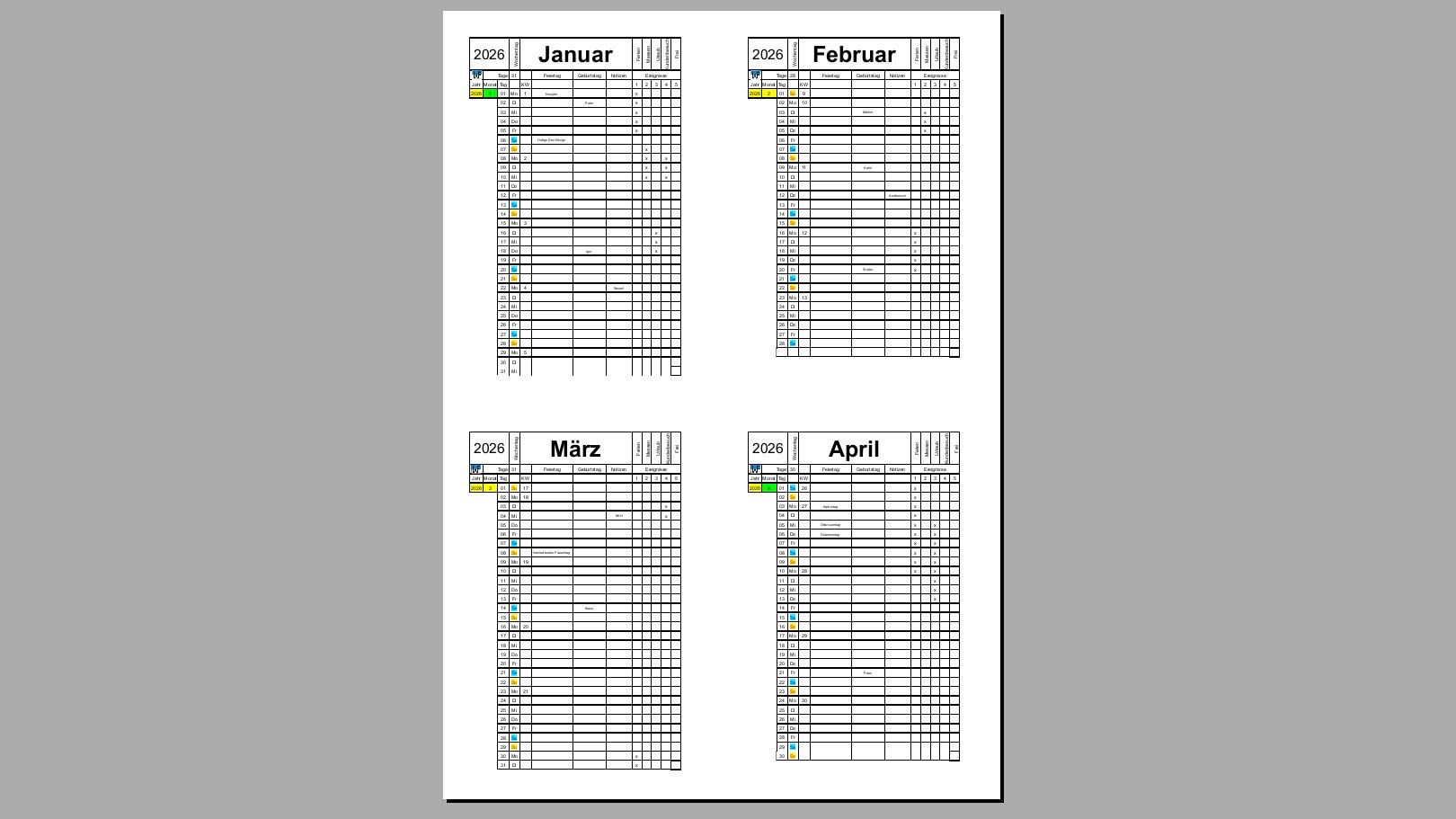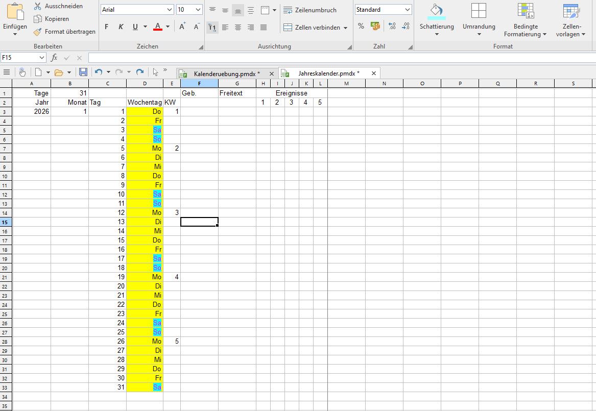 Dadurch kann beispielsweise der Kalender für den Februar entsprechen gekürzt werden, wenn die entsprechenden Zellen passend formatiert werden, wozu sich beispielsweise weißer Text vor weißem Hintergrund anbietet.