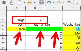 Sollte das Daum als Einzelwerte in verschiedenen Zellen vorhanden sein, so kann diese Funktion ebenfalls verwendet werden, indem die einzelnen Datumsbestandteile entsprechend eingebettet werden: =TAGEIMMONAT((DATUM(A4;B4;C4))).