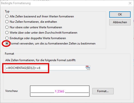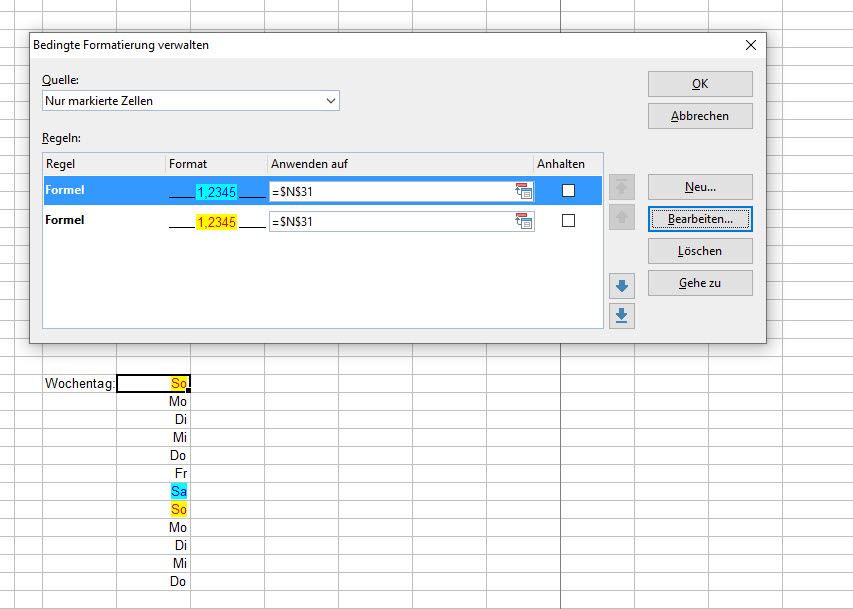 Werden Regeln auf die Wochentage gelegt, so können mit dem Eintrag =WOCHENTAG($N31)=1 der Sonntag und mit =WOCHENTAG($N31)=7 der Samstag farblich unterschiedlich hervorgehoben werden.
