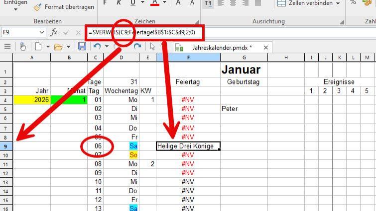Beispielsweise prüft =SVERWEIS(C4;Feiertage!$B$1:$C$49;2;0), ob in einer Matrix sich das gesuchte Datum befindet und fügt den in der zweiten Spalte rechts vom gefundenen Datum stehenden Text in diejenige Zelle ein, in der sich der SVERWEIS-Befehl befindet.