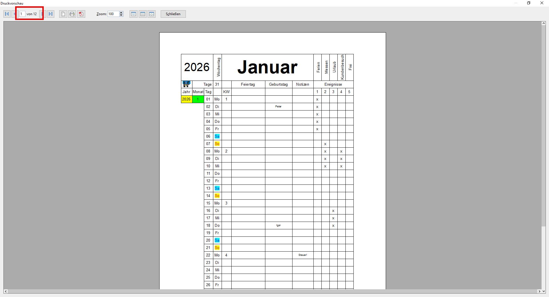 Wird nun der Button „Vorschau…“ angeklickt, so öffnet sich ein Fenster, in dem alle ausgewählten Kalendermonate durchgeblättert werden können.