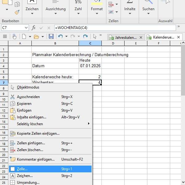 Um den Wochentag als Text zu bekommen, muss die Zelle entsprechend formatiert werden, wozu in beiden Programmen zunächst ein Rechtsklick auf die zu formatierende Zelle erfolgen muss. In Planmaker wird nun aus dem Kontextmenü der Eintrag „Zelle“ per Linksklick angewählt und anschließend die Kategorie „Benutzerdefiniert“ aktiviert.