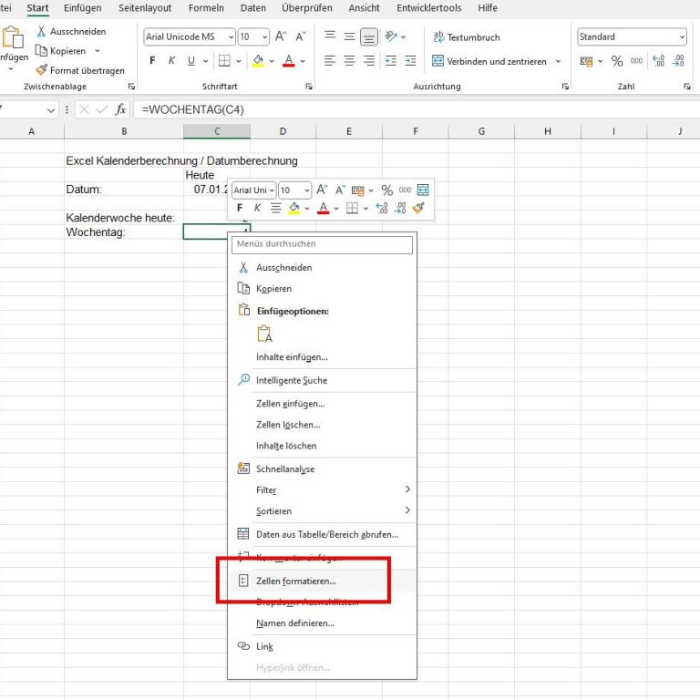Bei der Ermittlung des Wochentags setzen beide Programme auf die Funktion „=WOCHENTAG(ZELLE)“. Diese liefert allerdings nur eine Zahl zurück, die sich aus dem Sonntag als Starttag der Zählung ergibt. Die Zahl 4 bedeutet demnach, dass es sich beim Datum 7.1.2026 um den Mittwoch handelt, da es inklusive Sonntag vier Tage bis Mittwoch sind.
