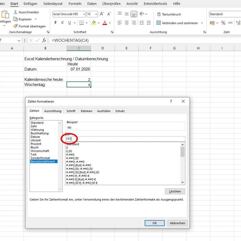 Nun genügt ein Klick auf den Eintrag „TTT“, um die Zelle entsprechend zu formatieren, damit dort künftig anstatt der Zahl der Wochentag angezeigt wird.