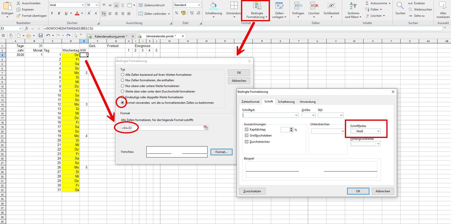 Mittels einer bedingten Formatierung können nun im Kalender überzählige Tage, etwa im Februar, unsichtbar gemacht werden, indem der Text in der Farbei Weiß formatiert wird, wodurch dieser nicht mehr sichtbar ist.