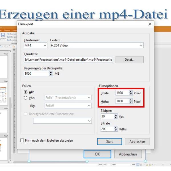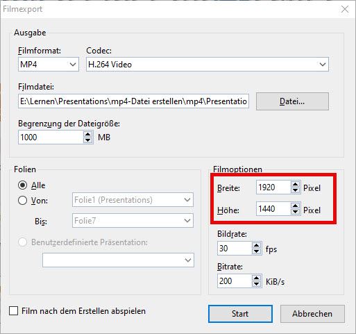 Mit dieser Einstellung kann die Präsentation in ein mp4-Video exportiert werden, was über „Einfügen / Film“ erfolgt.