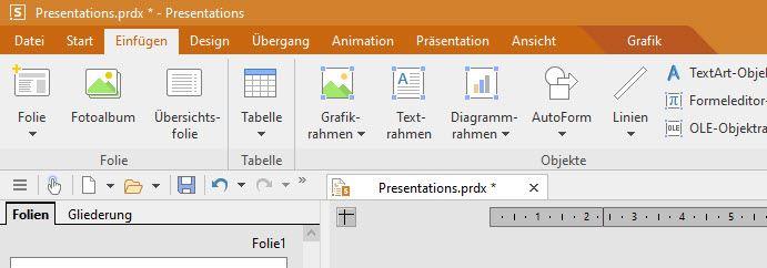 Die Anordnung und Ausgestaltung der Ribbon-Leiste unterscheidet sich nur wenig von derjenigen der Konkurrenz. Es sind sogar wesentliche Feinarbeiten getätigt worden, die dafür sorgen, dass der Umgang mit Presentations flüssig vonstattengeht.