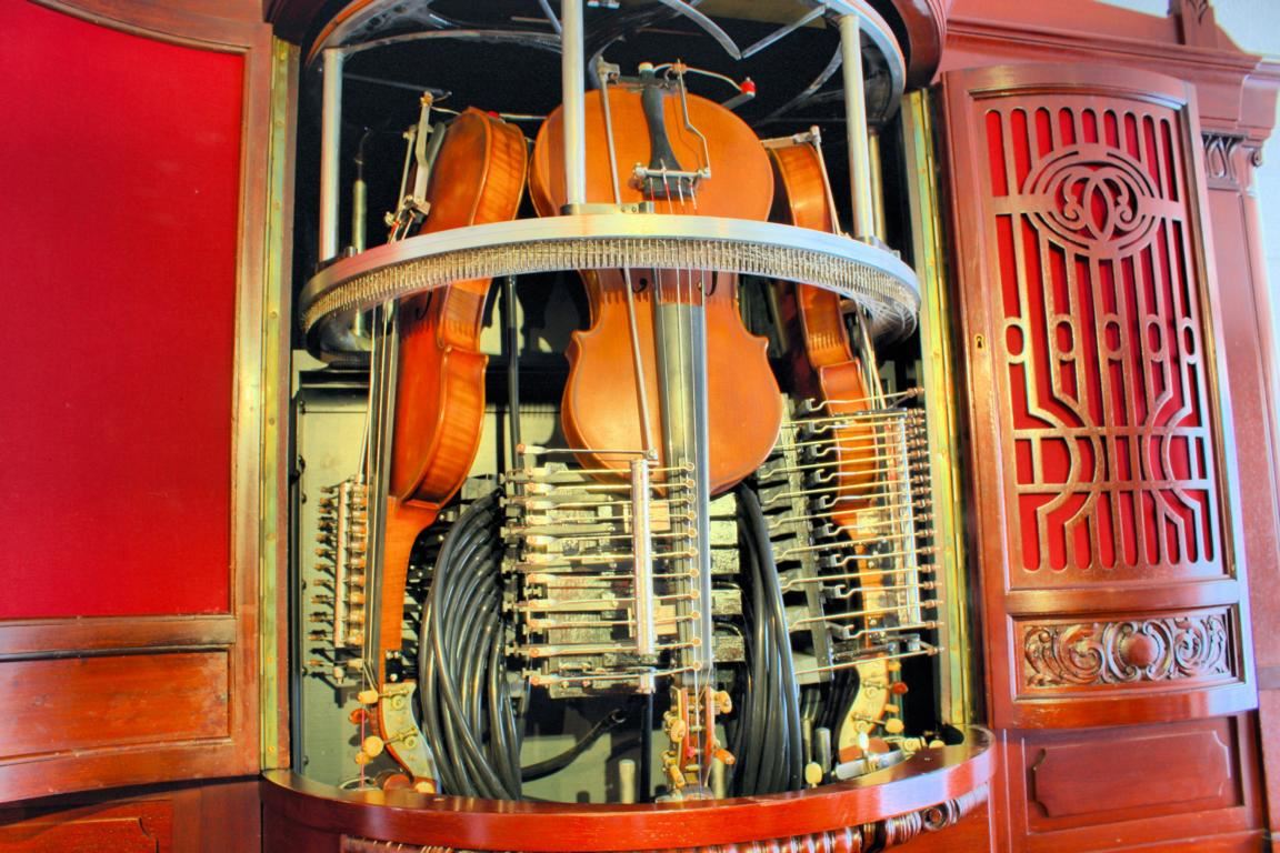 Das Besondere am Deutschen Musikautomaten-Museum ist, dass nahezu alle Instrumente vorführbereit sind und daher der einmalige Sound dieser Orchestrien live genossen werden kann. Insbesondere die jüngeren Exemplare besitzen eine unglaublich mitreißende Klangfülle, die man unbedingt einmal erlebt haben muss. Kein Wunder, dass diese Instrumente nicht nur auf Jahrmärkten, sondern auch in Gasthäusern vorzufinden waren. Schließlich sorgen Menschen mit guter Stimmung für ein sattes Umsatzplus. Bewegte Figuren waren ein beliebtes Beiwerk großer Orchestrien. Doch wurden diese auch gerne in den Mittelpunkt gerückt, wie das ebenfalls im Museum zu bewundernde Orchestrion ›Pneuma-Accordeon Jazz‹ zeigt. Die Figuren bewegen die Augen, drehen den Kopf, öffnen den Mund und ziehen die Augenbrauen nach oben. Derart interessante mechanische Konstruktionen finden sich hinter jedem Gehäuse von Orchestrions. Besonders hervorzuheben ist das Modell B der ›-Phonoliszt- Violina ‹ des Unternehmens Ludwig Hupfeld. Dieser Firma war es gelungen, ein Klavier mit echten Geigen zu kombinieren. Gesteuert von einer Notenrolle werden drei aufrecht stehende Geigen durch eine pneumatisch betriebene Mechanik nach vorn gegen einen rotierenden kreisförmigen Geigenbogen gedrückt, wodurch die Saiten zum Schwingen kommen. Kleine Tastenhebel greifen am Hals der Geige in die Saite, wodurch die Tonhöhe variiert wird. Die Lautstärke hingegen wird durch unterschiedlich starkes Andrücken der Saiten an den rotierenden Ringbogen erzielt. Ein mechanisches Wunderwerk, das damals als „achtes Weltwunder“ bezeichnet wurde. Ein Titel, der sicher übertrieb, doch angesichts des unglaublichen mechanischen Aufwands schon ein klein wenig berechtigt war. Überhaupt gibt es im Museum eine große Fülle außergewöhnlicher Exponate zu sehen, die nicht nur mit ihrer Technik, sondern auch mit ihrer Geschichte überraschen. So ist in Bruchsal beispielsweise eine Orgel zu besichtigen, die gerne immer wieder als „Titanic-Orgel“ bezeichnet wird. Es handelt sich hierbei um eine im Jahre 1912 vom Freiburger Unternehmen Welte gebaute Philharmonie-Salonorgel, die der Legende nach für den Luxus-Dampfer ›Titanic‹ gebaut worden sein soll. Dem Untergang des Schiffes entkam sie und blieb der Nachwelt erhalten, da sie, so eine These, nicht rechtzeitg fertiggestellt werden konnte. Die papierrollenbetriebene Orgel gehörte zum Modernsten, was Musikautomatenhersteller damals produzierten. Ihr Aufbau unterscheidet sich in vielerlei Hinsicht von den Orchestrien und bot neuen klanglichen und ästhetischen Genuss..