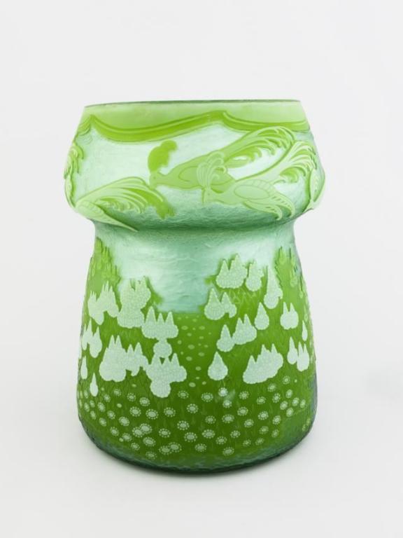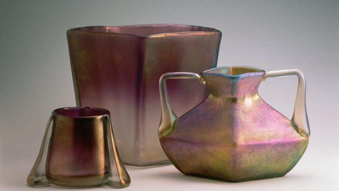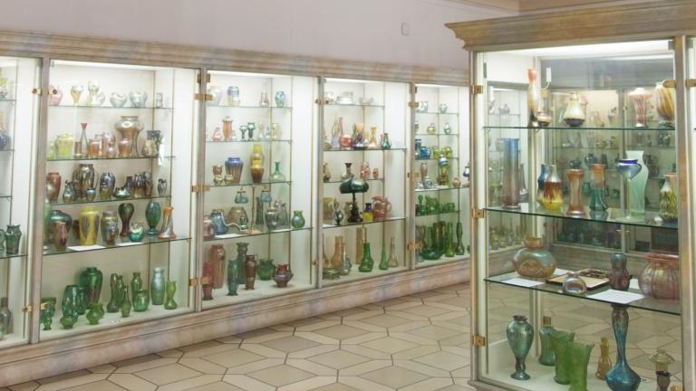 So gibt es hier beispielsweise eine Vase mit Kirschblüten aus der Glashütte Johann Lötz zu sehen, die im Jahre 1892 für die in Chicago im Jahre 1893 abgehaltene Weltausstellung produziert wurde. Mit dem Modell ›Sonnenuntergang‹ hatte das gleiche Unternehmen eine Vase für die Pariser Weltausstellung im Jahre 1900 hergestellt, die in Überfangtechnik ausgeführt wurde. Auf diese Weise war es möglich, einen Farbverlauf zu realisieren, der einem Sonnenuntergang ähnelte.