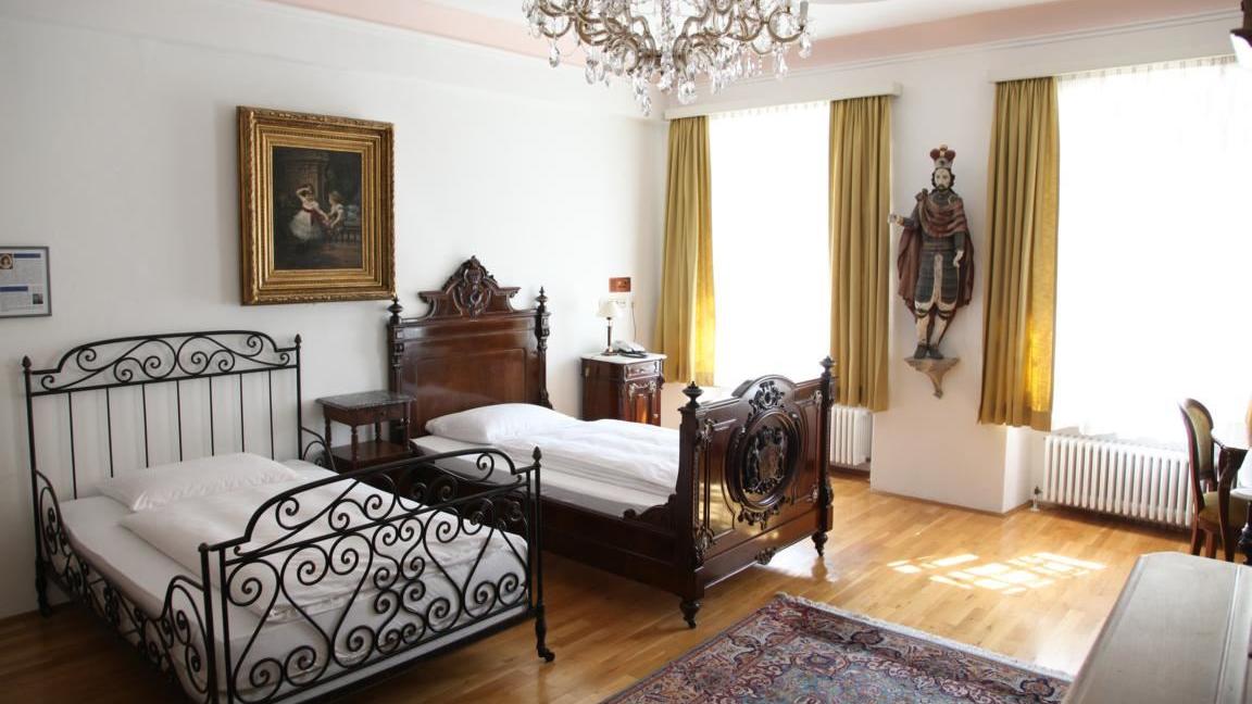 Während das Eckhaus jahrhundertelang das Stadtrichterhaus war, war ein weiteres Gebäude das Hotel ›Wilder Mann‹, in dem bereits im 19. Jahrhundert viele berühmte Persönlichkeiten zu Gast waren. 1862 und 1878 übernachtete hier sogar Kaiserin Elisabeth von Österreich. Zwar sind aus dieser Zeit die damals genutzten Betten und Möbel nicht mehr vorhanden, doch hat Georg Höltl – der Gründer von Hotel und Glasmuseum – ein Schlafzimmer-Garnitur aus dem Jahre 1895 erworben, das sich im persönlichen Besitz von Kaiserin Elisabeth befand.