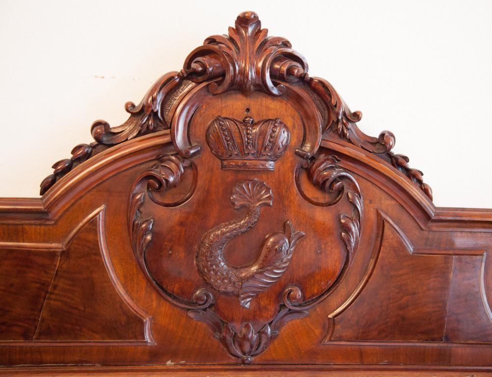 Die Vorderpartie des Bettes trägt das Allianzwappen gehalten von zwei Greifen. Das Pendant zu diesem Bett befindet sich im Wiener Hofmobiliendepot, dem Wiener Möbelmuseum. Wer besonders nächtigen möchte, kann sogar das Zimmer buchen, in dem diese Schlafzimmer-Garnitur steht.