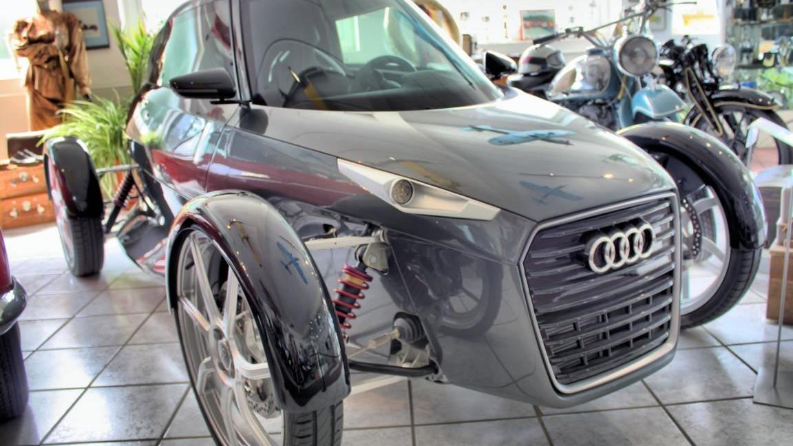 Lichtjahre von dieser Kuriosität entfernt ist das nur wenige Schritte weiter stehende Custombike ›Fatso‹ auf der Basis eines Harley-Motorrads. Dieses wuchtige Unikum wurde im Jahr 2012 von Joe Palermo in vielen 100 Arbeitsstunden erschaffen und hat in den USA völlig verdient unter anderem den Titel ›Best-Custom-Bike‹ gewonnen.