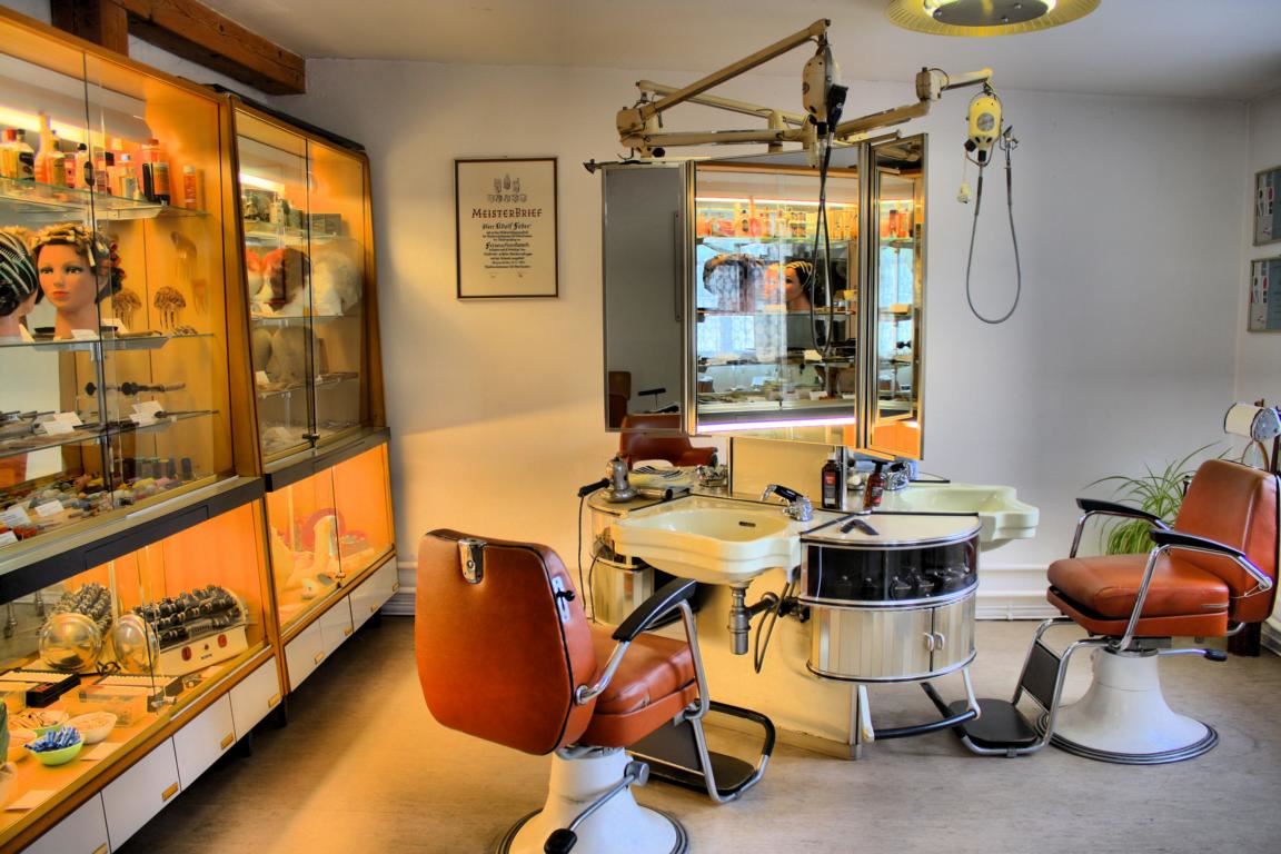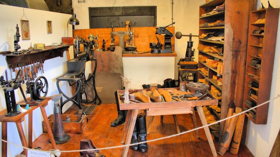 Auch der Blick in die Vitrinen lohnt. So sind zum Beispiel Schuhe eines Gebirgsjägers aus dem 2. Weltkrieg zu sehen, die der damalige Besitzer im Russlandfeldzug trug. Während des Krieges in den Jahren 1941 bis 1943 ist er damit von Charkow in der Ukraine bis Baku im Kaukasus gelaufen. Kleine Flickstellen am Schaft des linken Schuhes rühren von einem Splitter eines Artilleriegeschosses her, weshalb der linke Fuß amputiert werden musste. Ein voll eingerichteter Friseursalon aus den 1960er Jahren zeigt, was damals für Haarmode bestand, und in welchem Umfeld sich die Bürger dem Styling ihrer Haarpracht hingaben. Hier ging sicher auch so mancher Zeitgenosse ein und aus, der in der Ventilkegelfabrik Dietz & Pfriem sein Brot verdiente.