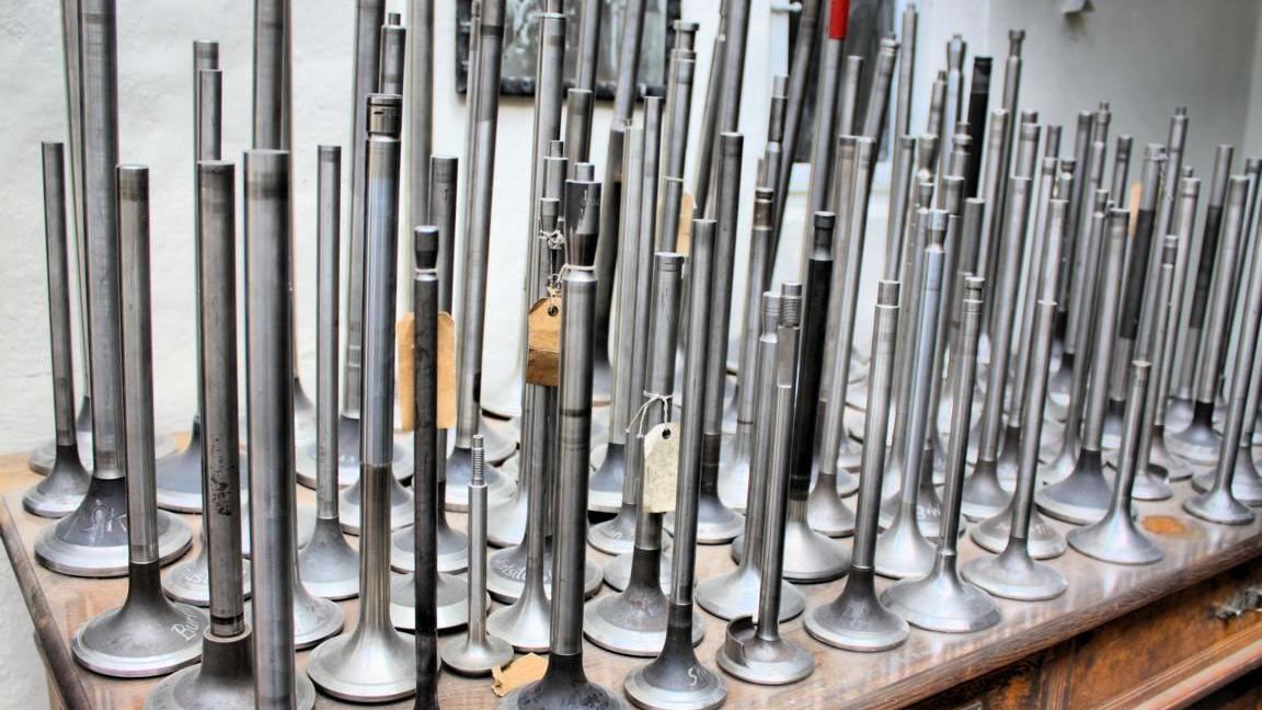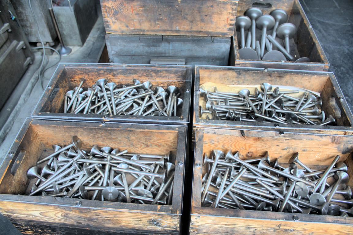 Das Stauchen war eine entscheidende Fertigkeit, um hochleistungsfähige, langlebige Ventile herzustellen. Nach dem Pressen wurden die Ventile im ebenfalls zu sehenden Ofen geglüht, gehärtet und angelassen. Verzogene Ventile wurde im Schraubstock eingespannt und von Hand wieder geradegerichtet, ehe sie weiterverarbeitet wurden.