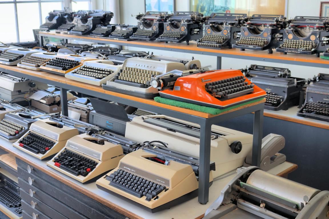 Dazu passt die Sammlung von Triumph Adler-Büromaschinen, die aufzeigt, dass es damals für Konstrukteure nichts Besonderes war, eine komplizierte Mechanik zu ersinnen, die mühelos in der Lage war, den Druck auf eine Taste auf einen Typenhebel zu übertragen, der über ein zwischengeschaltetes Farbband einen Buchstaben auf das Papier zauberte.
