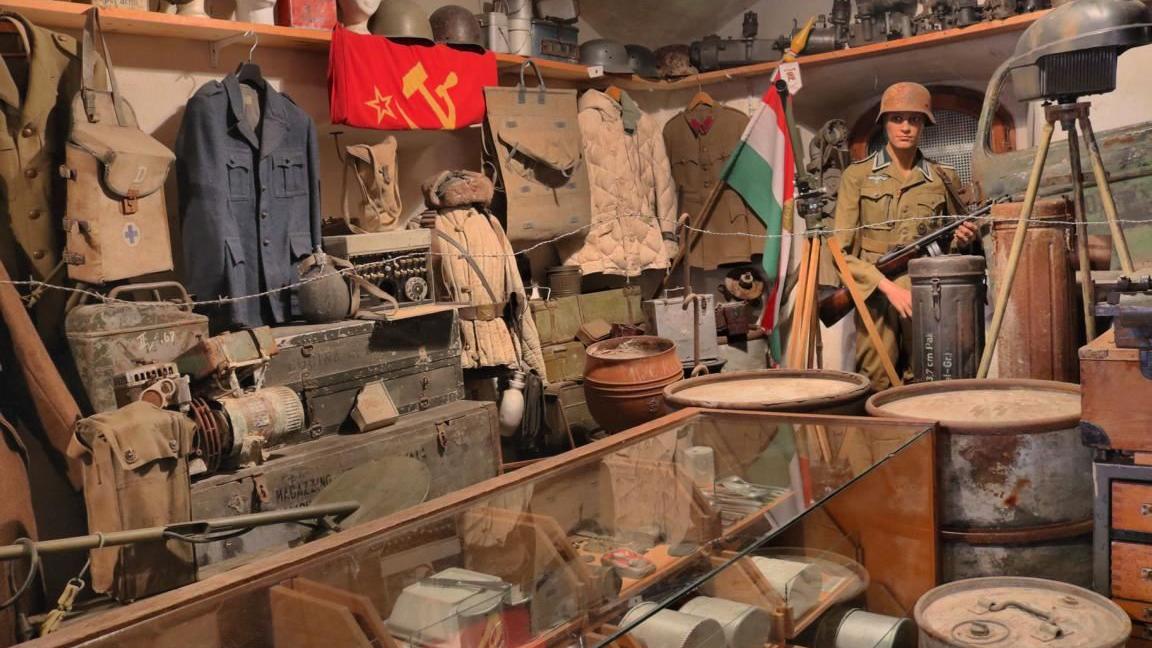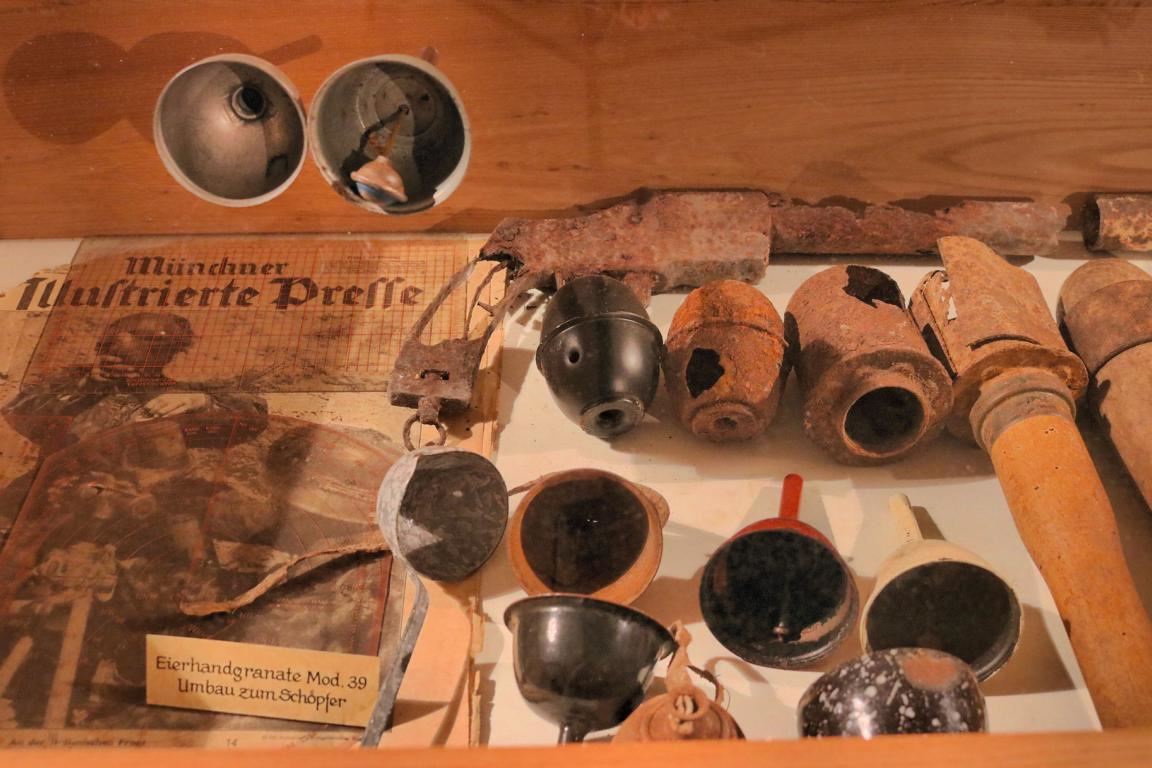 So gibt es im Museum beispielsweise Nudelsiebe zu sehen, die aus nicht mehr benötigten Stahlhelmen herausgearbeitet wurden, Granathülsen wurden zu Vasen, Eierhandgranaten zu Glocken, Behälter für Gasmasken zu Milchkannen, Wasserschläuche zu Fahrradschläuchen und Kartoffelsäcke zu Kleidungsstücken. Es lohnt sich sehr, alle diese Umbauten in Ruhe in Augenschein zu nehmen und sich in die damalige Zeit zu versetzen, um den unglaublichen Überlebenskampf der damals lebenden Menschen wenigstens ein klein wenig zu verstehen.