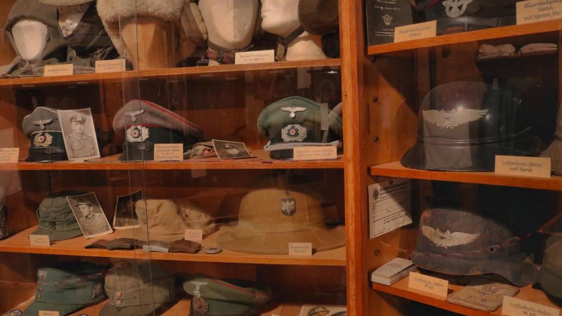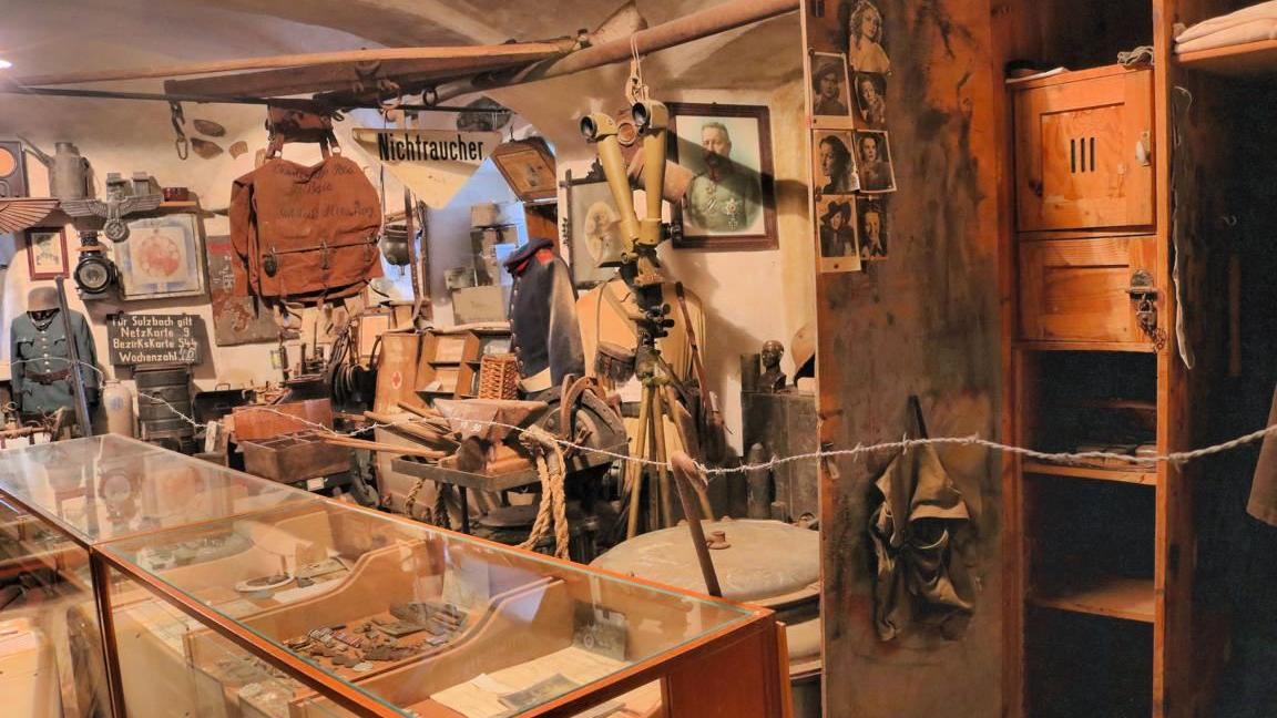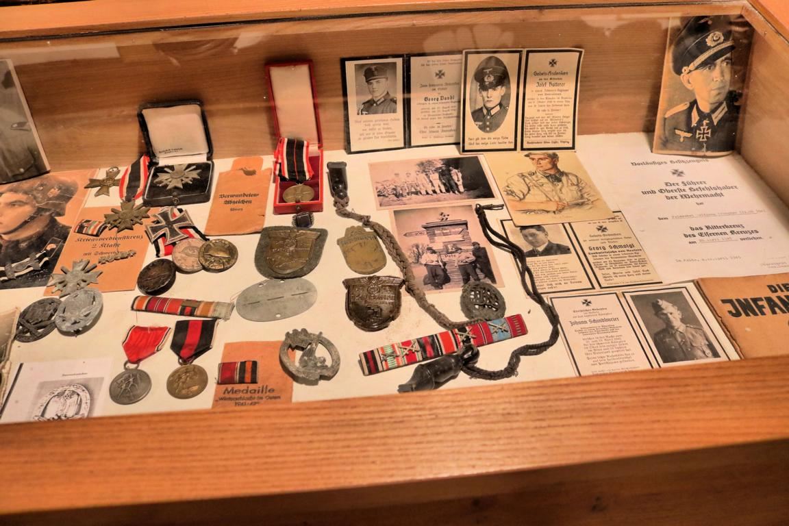 Doch zu sehen gibt es sehr viel mehr, weshalb man sich Zeit nehmen sollte, all die Exponate zu studieren, die Robert Niedermeier zusammengetragen hat. Ob Volksempfänger, Feldnähmaschine, Scherenfernrohr, Funkgerät, Stahlhelme, Orden, Uniformen, Einmannschlauchboot, Soldatenbilder, Flugabwehrgeschütze, Kraftfahrzeuge oder ein Modell des überschweren Panzers ›Maus‹ – eine überquellende Fülle an Sehenswertem will bewundert, studiert und eingeordnet werden.