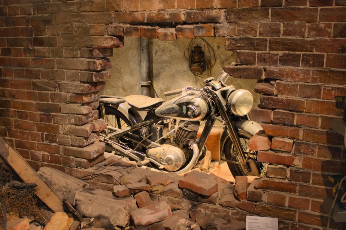 Beispielsweise wurde von den Dresdner Hainsberger Metallwerken im Auftrag der Sowjets ohne Lizenz ein Mofa produziert, dessen Motor aus einem enteigneten Sachs-Zweigbetrieb stammte. Ein besonderer Fingerzeig in einer passenden, mit Kriegslärm untermalten Abteilung ist auch das „eingemauerte Motorrad„, eine ›DKW NZ 350‹ von 1939, die der Besitzer auf diese Weise dem Zugriff des deutschen Militärs entzog. Die gezeigte Maschine ist praktisch neuwertig, da sie in Vergessenheit geriet und nur per Zufall wiederentdeckt wurde.