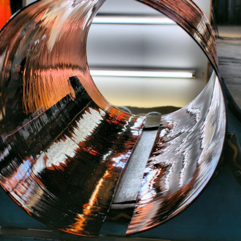 Nachdem der Zylinder geschlitzt ist, wird er langsam auf 850 Grad Celsius erhitzt. Dadurch wird er wieder formbar, was erlaubt, ihn am Ende des Ofens auf einer flachen Platte abzuwickeln.