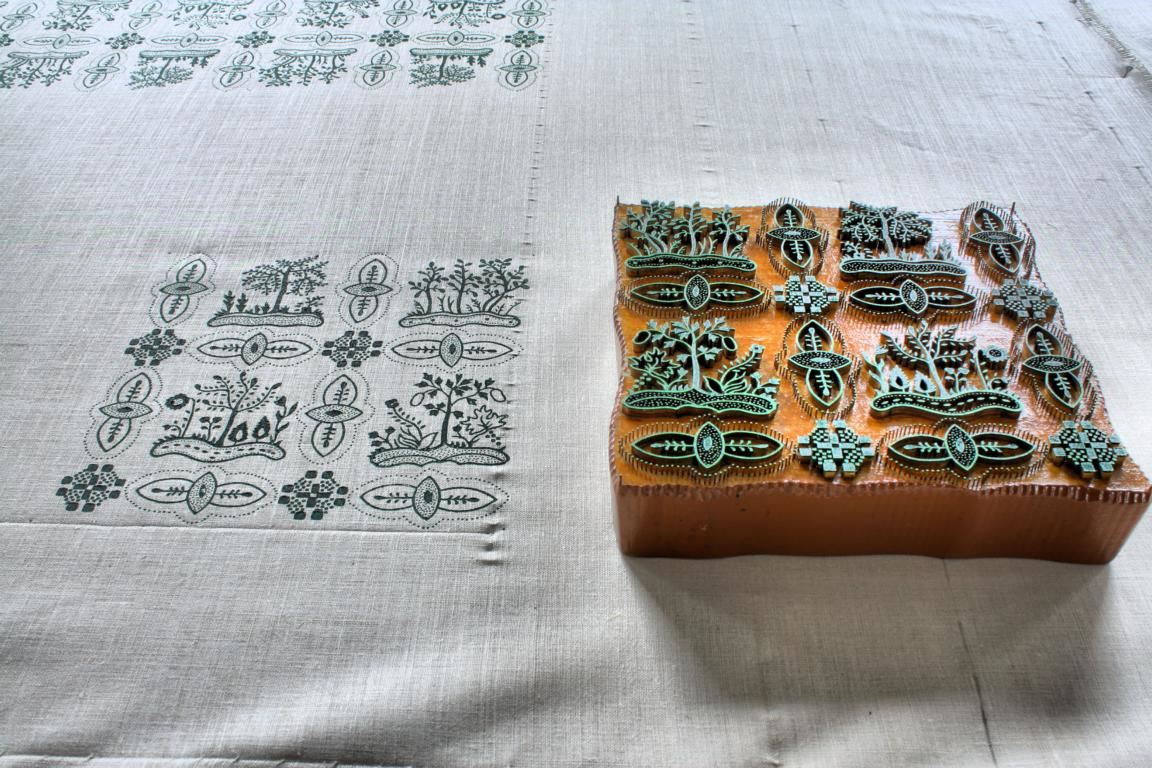 Damit die Muster akkurat in Deckung gebracht werden können, besitzen die Model an passenden Stellen einige Justierpunkte, die sich ebenfalls auf dem Stoff abzeichnen und beim Arbeiten mit den verschiedenen Modeln jeweils zur Deckung gebracht werden müssen. Auf diese Weise entsteht nach und nach eine Stoffbahn aus Leinen oder Halbleinen mit schönsten Mustern.