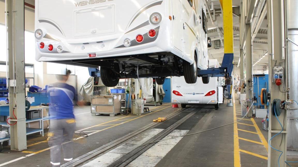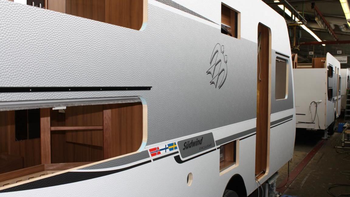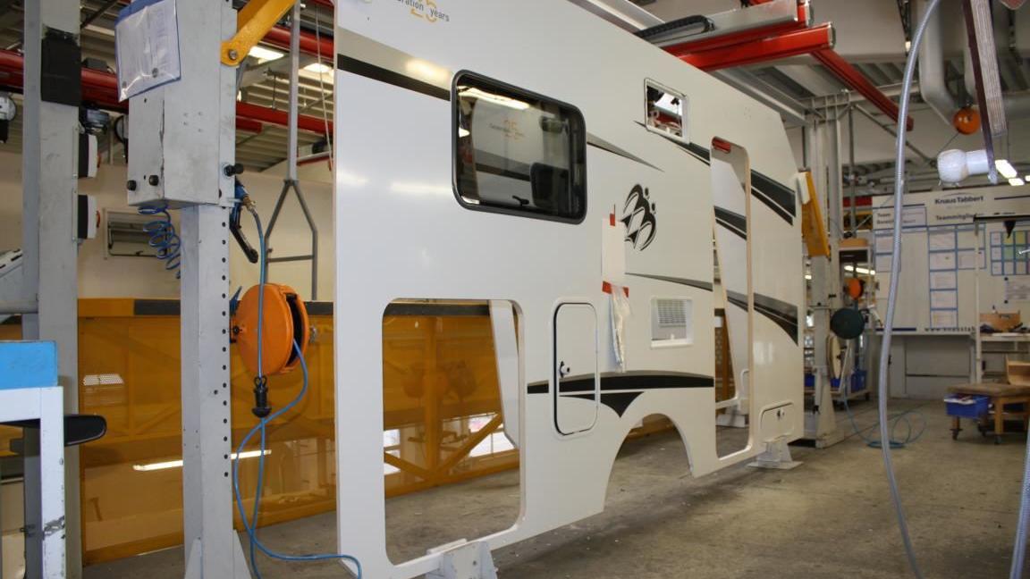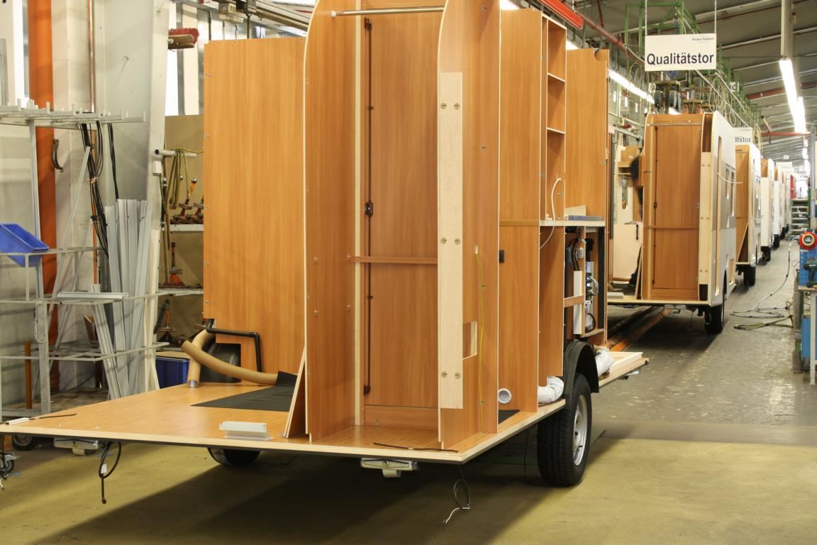 Die Produktion von Caravans und Wohnmobilen unterscheidet sich sehr von der PKW-Produktion. Was man hier schon gar nicht zu Gesicht bekommt, sind Roboter, die die Karosserie verschweißen oder Räder montieren. Dies ist auch nicht möglich, da zum einen die produzierten Stückzahlen zu gering sind, Roboter sich also nicht rechnen und zum anderen die Handarbeit in diesem Sektor nicht so einfach zu ersetzen ist. Schließlich müssen Holzrahmen sorgfältig verschraubt, verklebt oder verklammert werden.