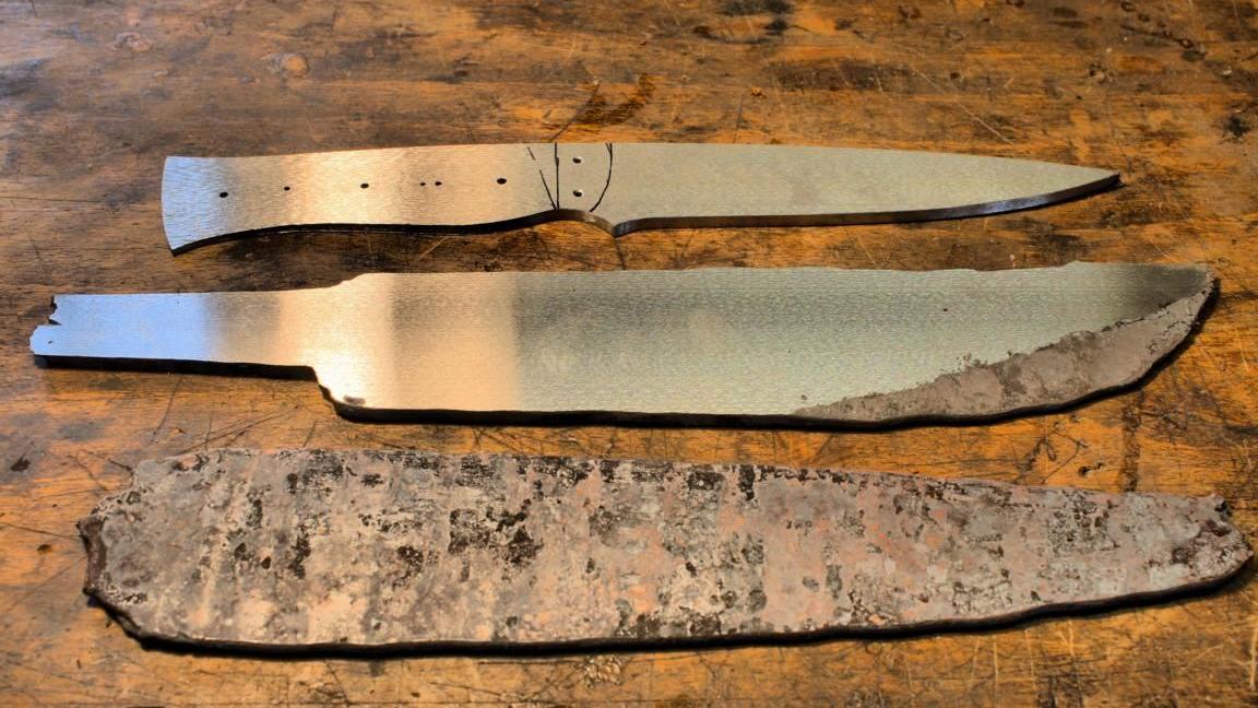 Nachdem das Stahlpaket passend geschmiedet wurde, wird der Stab in entsprechend lange Stücke zerteilt, die dann zu einer noch sehr groben Messerform ausgeschmiedet werden. Diese Messer-Rohlinge kommen anschließend auf eine Flachschleifmaschine. Hier werden sie vom Zunder befreit und eben geschliffen. Die nun blanken Rohlinge werden in diesem Stadium mit Bohrungen versehen, wenn später die Griffe vernietet werden oder erhalten am Griffstück sogar Passungen, wenn der Griff und der Messerkörper als verklebte Einheit gewünscht sind.
