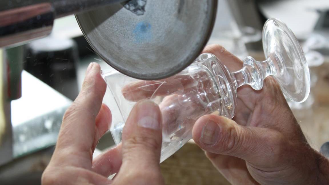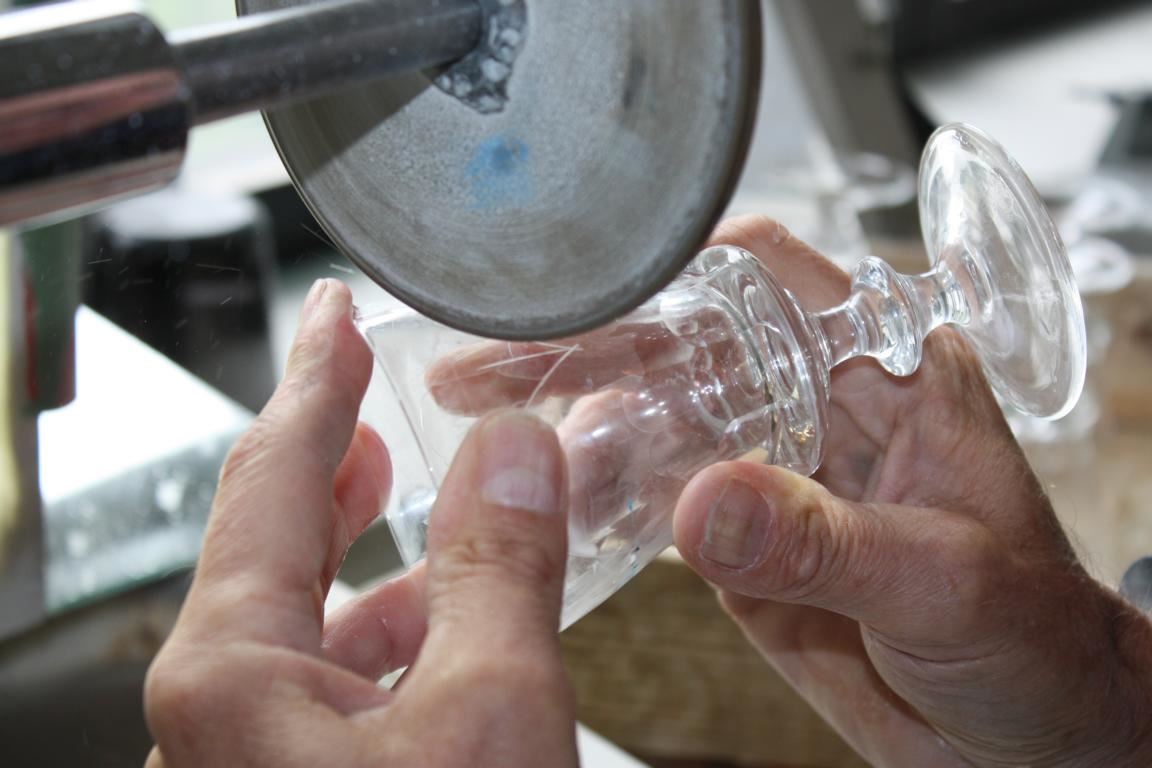 Da ist zum Beispiel der absolut exakte Schliff eines Mehrkants am Glasfuß oder die hochwertige Verzierung des Glasrands mit einem achtpünktigem Ornament. Diese unscheinbaren Details sind nicht trivial, sondern das Werk eines wahren Meisters der Glasverarbeitung. Es kommt darauf an, das Glas an der Schleifscheibe mit höchster Genauigkeit zu führen, um den perfekten Schliff zu erzielen, beziehungsweise exakt die richtige Menge Glas auf das Glasgefäß zu geben, sodass die Glasmasse tropfengenau in das formgebende Holzmodel passt.