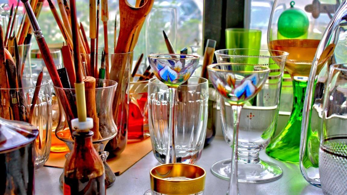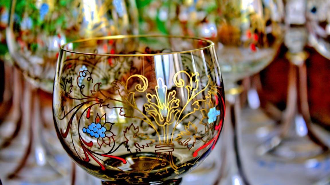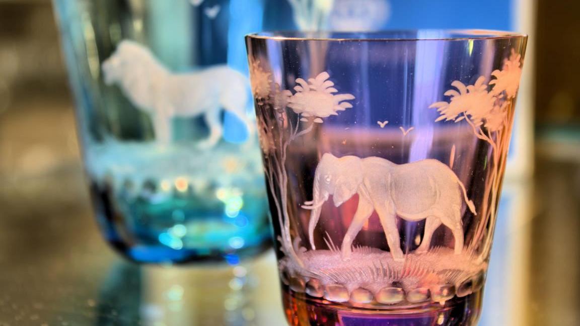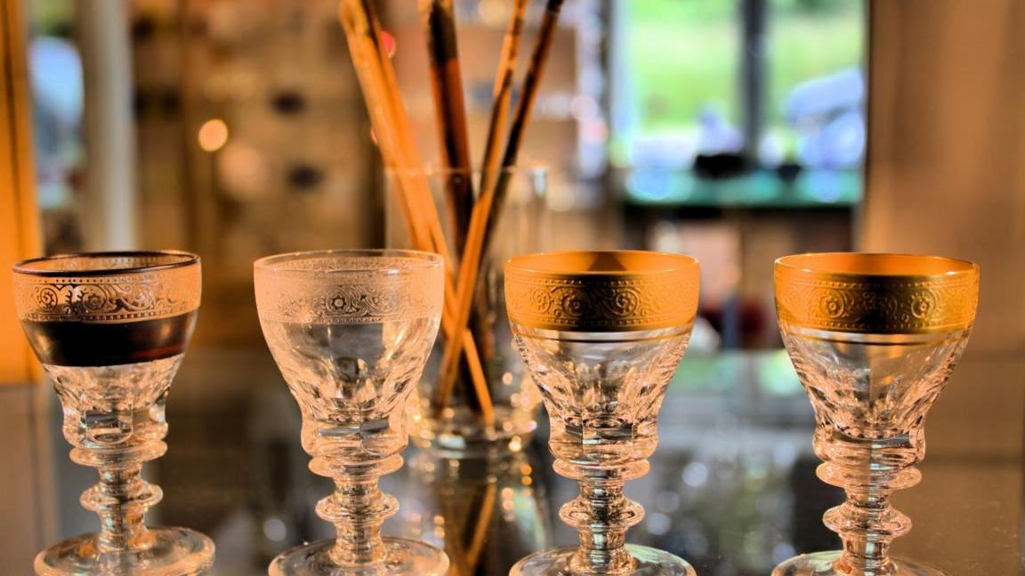 Faszinierend auch die Erkenntnis, wie es die Künstler schaffen, Gläser mit überaus detaillierten Kunstwerken zu veredeln: Sie malen auf das Glas mit einem wasserfesten Stift die Verlaufslinien der Schliffkante ein beziehungsweise bekleben die Innenseite des Glases mit einem Papierstreifen, auf dem sich die Kontur des aufzumalenden Musters befindet. Dieses Muster wird dann auf der Außenseite des Glases mit einem in Poliergold getauchten Kaligraphiestift abgepaust.