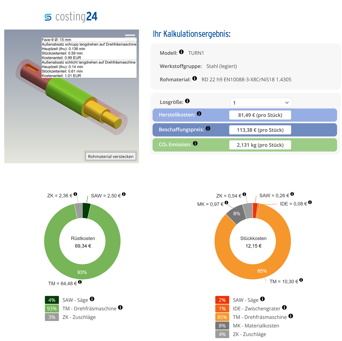 costing24 liefert blitzschnell die Herstellkosten von Dreh-, Fräs-, Flach- und Biegeteilen einschließlich ihrer Nachbehandlung. Dazu wird ein 3D- Modell aus führenden CAD-Systemen oder in den Standardformaten JT mit XT- Brep oder STEP hochgeladen. Registrierte Anwender können Stundensätze, Schnittwerte sowie Rüst- und Nebenzeiten individuell einstellen, den virtuellen Maschinenpark anpassen, Berechnungsvarianten anlegen und bis zu