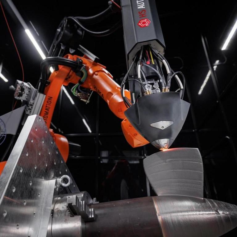 Herausforderungen der modernen Fertigung in der Metallindustrie gerecht werden: Das geht mit der modularen Automationszelle, die HS Automation für eine neue Art des 3D-Metalldrucks entwickelt hat. Das Laserschweißverfahren mit einem KUKA Roboter ermöglicht eine wirtschaftliche und materialschonende Fertigung von komplexen Metallteilen – ohne Verwendung jeglicher Stützstrukturen.
