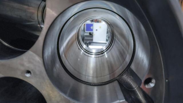 „Das zu bearbeitende Teil weist sechs Bohrungen auf, die jeweils drei ineinander übergehende zylindrische Bereiche mit Durchmessern von 100, 99 und 98 mm aufweisen“, erläutert Jean-Luc Maurer. Die Konzentrizitätsabweichung aller drei Bohrungen darf ungeachtet der beachtlichen Gesamtlänge von knapp 345 mm nicht mehr als 10 µm betragen. Dazu findet sich im ersten Bereich, in dem ein H5-Durchmesser gewährleistet werden muss, eine Nut. Das bedingt einen unterbrochenen Schnitt mit entsprechenden Auswirkungen auf die Auslenkung und die Schwingungsanregung des eingesetztes Feinbohrwerkzeugs.