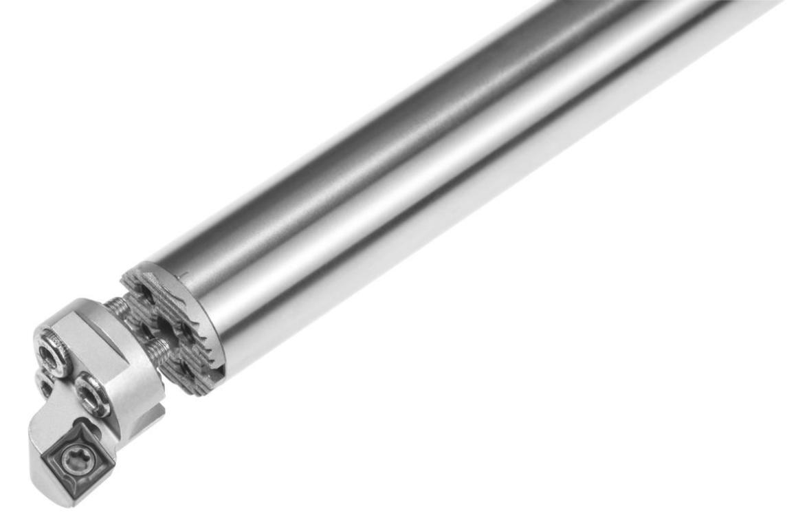 Die schwingungsdämpfende Bohrstange GARANT Master Mute passt ihr Dämpfverhalten in Echtzeit an veränderte Bearbeitungsbedingungen an und dreht sogar tiefe Bohrungen in schwer zugänglichen Bauteilen präzise aus. Das Ergebnis sind hochwertige Oberflächen und Produktivitätsgewinne, weil Schnitttiefe, Schnittgeschwindigkeit und Vorschub nicht reduziert werden müssen. GARANT Master Mute verfügt über ein neuartiges Dämpfungssystem, muss nicht kalibriert werden und ist neuerdings auch für Auskraglängen bis 15xD erhältlich. Das Werkzeug passt auf Wechselschneidköpfe der Systeme GL, QC und DM.
