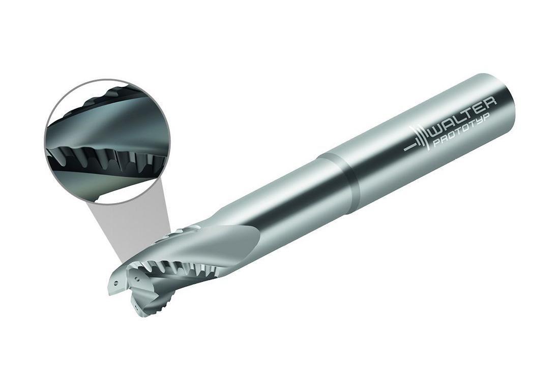 Für beide Fräser typisch ist die »V-Schneide« – eine Walter-Entwicklung, die am Markt bislang einzigartig ist und die den Wärmeeintrag ins Material minimiert. Die geriffelten Schneidkantenprofile der Fräser zerlegen die Späne in kurze, gut beherrschbare Segmente. Dies erhöht die Prozesssicherheit und die Anwender können mit geringerer Schnittkraft fahren – was Spindelleistung spart bzw. die Effizienz der eingesetzten Leistung maximiert.