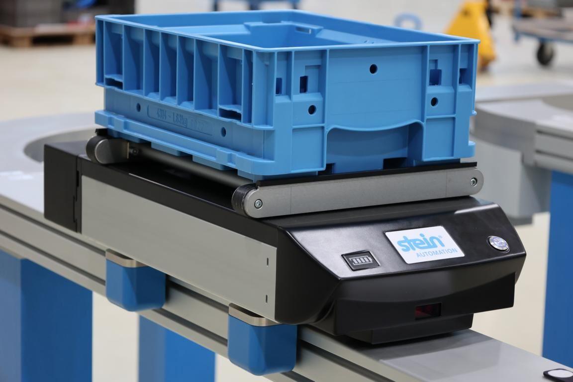 Das STEIN link besteht aus akkubetriebenen Shuttles, einem einfach erweiterbaren Streckensystem und einer übergeordneten Steuerung, in der die Intelligenz der Lösung steckt: Sie koordiniert die Routen und kommuniziert über ein eigenes Wireless-Mesh-Netzwerk mit den Fahrzeugen. Diese können über einen Werkstückträger oder in einer Transportbox Lasten bis zu 80 Kilogramm aufnehmen und sich mit einer Geschwindigkeit von maximal 50 Metern pro Minute bewegen. Das System arbeitet besonders sicher: Ein integrierter Sensor erfasst die Umgebung vor dem Shuttle und sorgt dafür, dass es vor jedem Hindernis sanft abbremst. RFID-Tags entlang der Strecke vermitteln zusätzliche Informationen wie zum Beispiel die ideale Geschwindigkeit für den nachfolgenden Abschnitt.