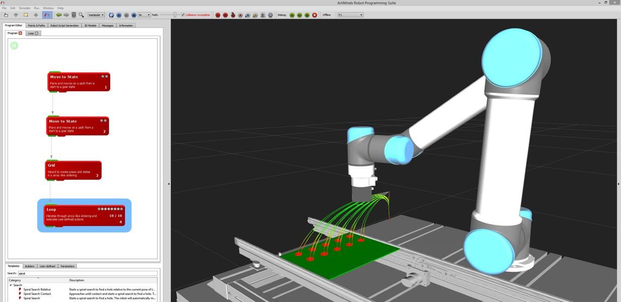 Diese Hürden hat die auf komplexe Automatisierungsaufgaben, beispielsweise in der industriellen Bauteilreinigung und Oberflächenbehandlung sowie für die Mikrodosierung und der Entwicklung intelligenter Handhabungslösungen, spezialisierte acp systems AG mit der innovativen Softwarelösung von ArtiMinds Robotics aus dem Weg geräumt. Die ArtiMinds Robot Programming Suite (RPS) ermöglicht die intuitive Programmierung von Robotern zahlreicher namhafter Hersteller inklusive damit kompatibler Peripherie-Hardware wie Greifer, Kamera, Kraft-Momenten-Sensor ohne eine Zeile Code selbst schreiben zu müssen. Offline- und Online-Programmierung werden dafür nahtlos miteinander kombiniert und ermöglichen eine effiziente Programmerstellung sowie durchgängige Planung, Programmierung und Inbetriebnahme.